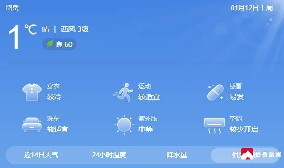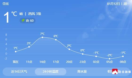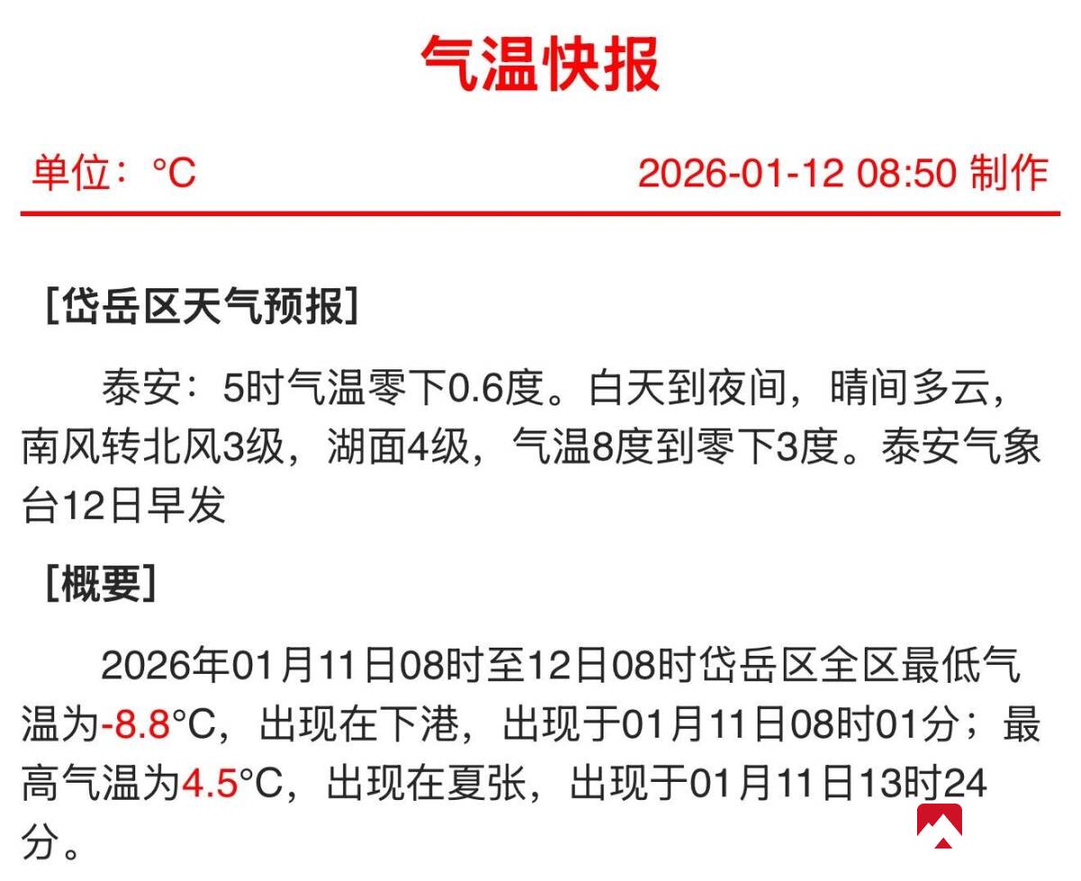 岱岳融媒讯:5时气温零下0.6度。白天到夜间,晴间多云,南风转北风3级,湖面4级,气温8度到零下3度。